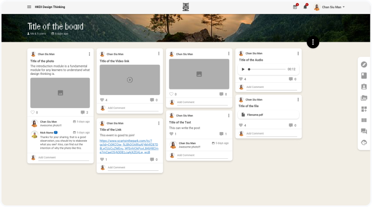 HKDI is an influential post-secondary design institution. Design Thinking is one of its fundamental courses. While Design Thinking requires hands-on practices, the school's existing online learning portal could not support this need. I helped HKDI design its new interactive and collaborative online learning platform to support the course's teaching, learning and management.